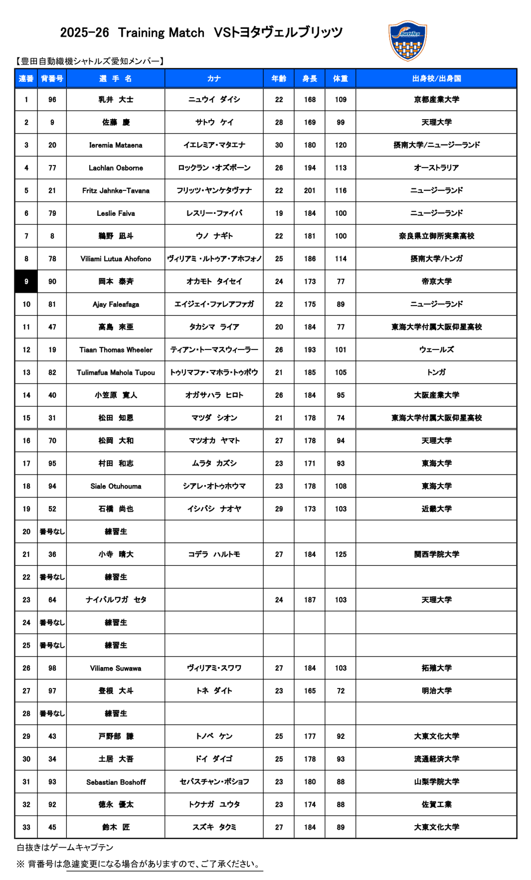 2025/12/26(金) vsトヨタヴェルブリッツ出場メンバー